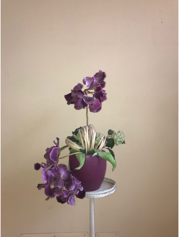 Delicata e sofisticata insieme, l'orchidea in lattice touch dal gradevole tocco, insieme ad Ortensia e Lavanda in tessuto. Riccioli di legno, foglie in polifon e vaso di porcellana in tinta.