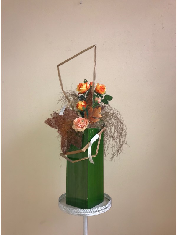 Fresca e fantasiosa composizione di rose arancio in tessuto, papiro e rami essiccati in vaso di legno di bamboo.